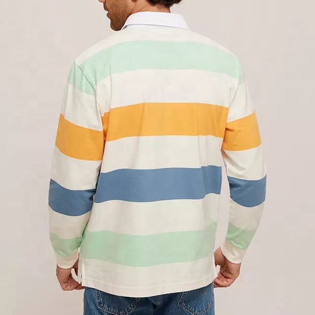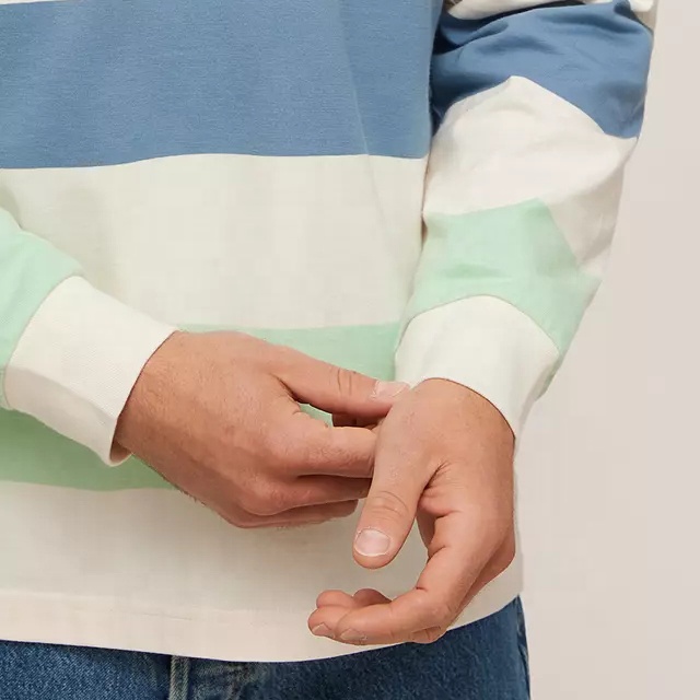 Men 100% Cotton Striped Long Sleeves Rugby Polo Shirt for Men Custom Embroidered Logo