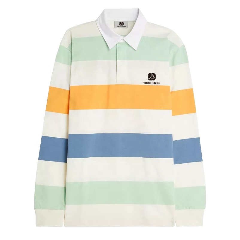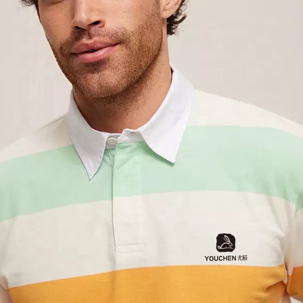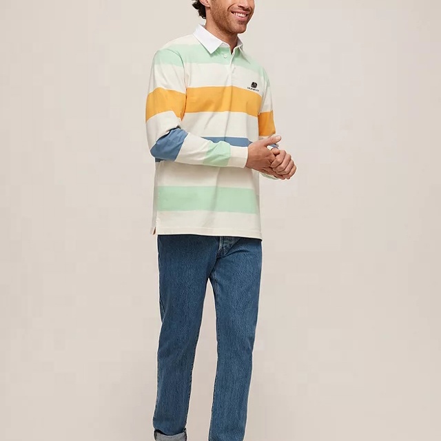 Men 100% Cotton Striped Long Sleeves Rugby Polo Shirt For Men Custom Embroidered Logo
