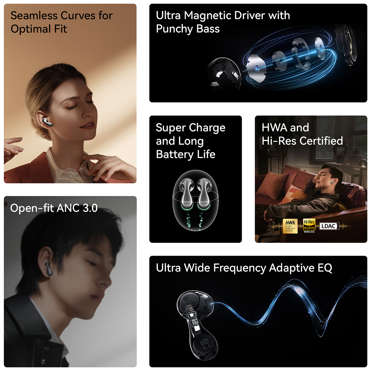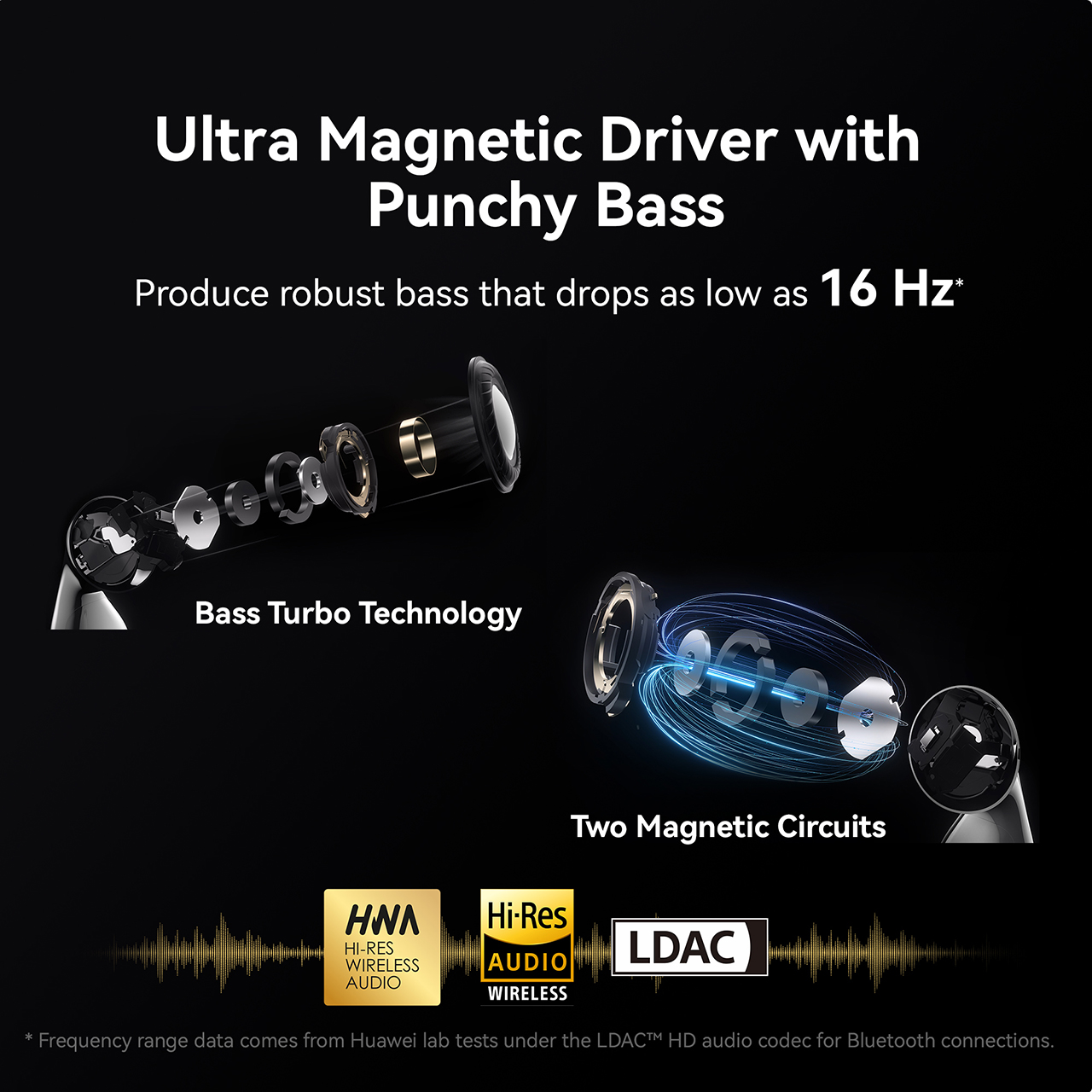 • Ultra Magnetic Driver with Punchy Bass | HUAWEI FreeBuds 5 is 30%2 more sensitive at low frequencies than HUAWEI FreeBuds 4, and produces robust bass that drops as low as 16 Hz3. These earbuds pack even more punch, by boosting airflow while reducing the resistance the diaphragm experiences during vibrations, thanks to proprietary tech and a custom tube.