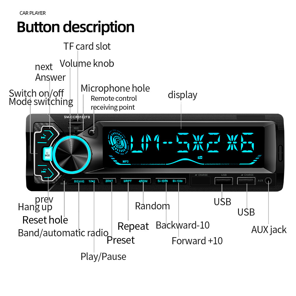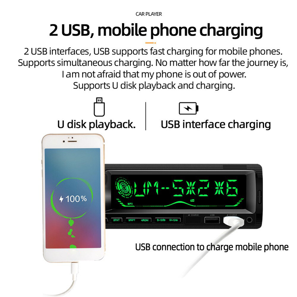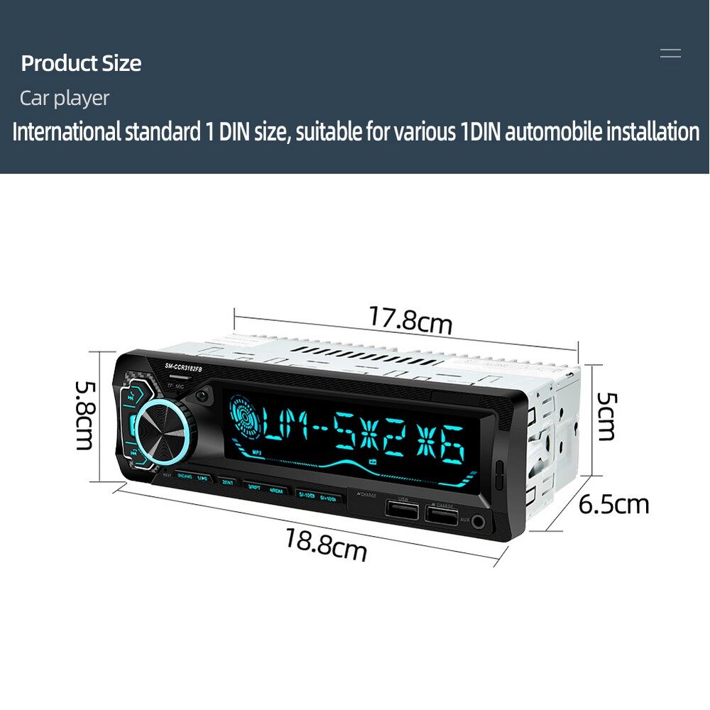 • Support three-band radio store FM1-FM2-FM3, and can preset 18 radio stations. (Radio frequency: 87.5-108MHz)
