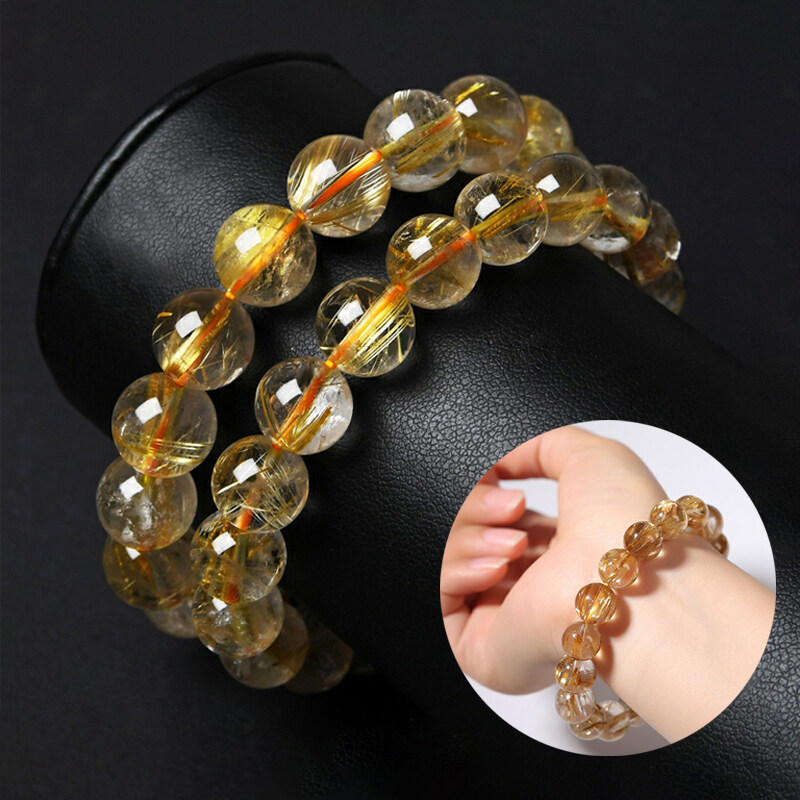 Natural Brazilian Titanium Gold Crystal Bead Bracelet Yellow Crystal Bead Quartz Healing Collection Grade Hair Crystal Single Circle Men's and Women's Lucky Bead Jewelry Bracelet Male Lucky Bracelet