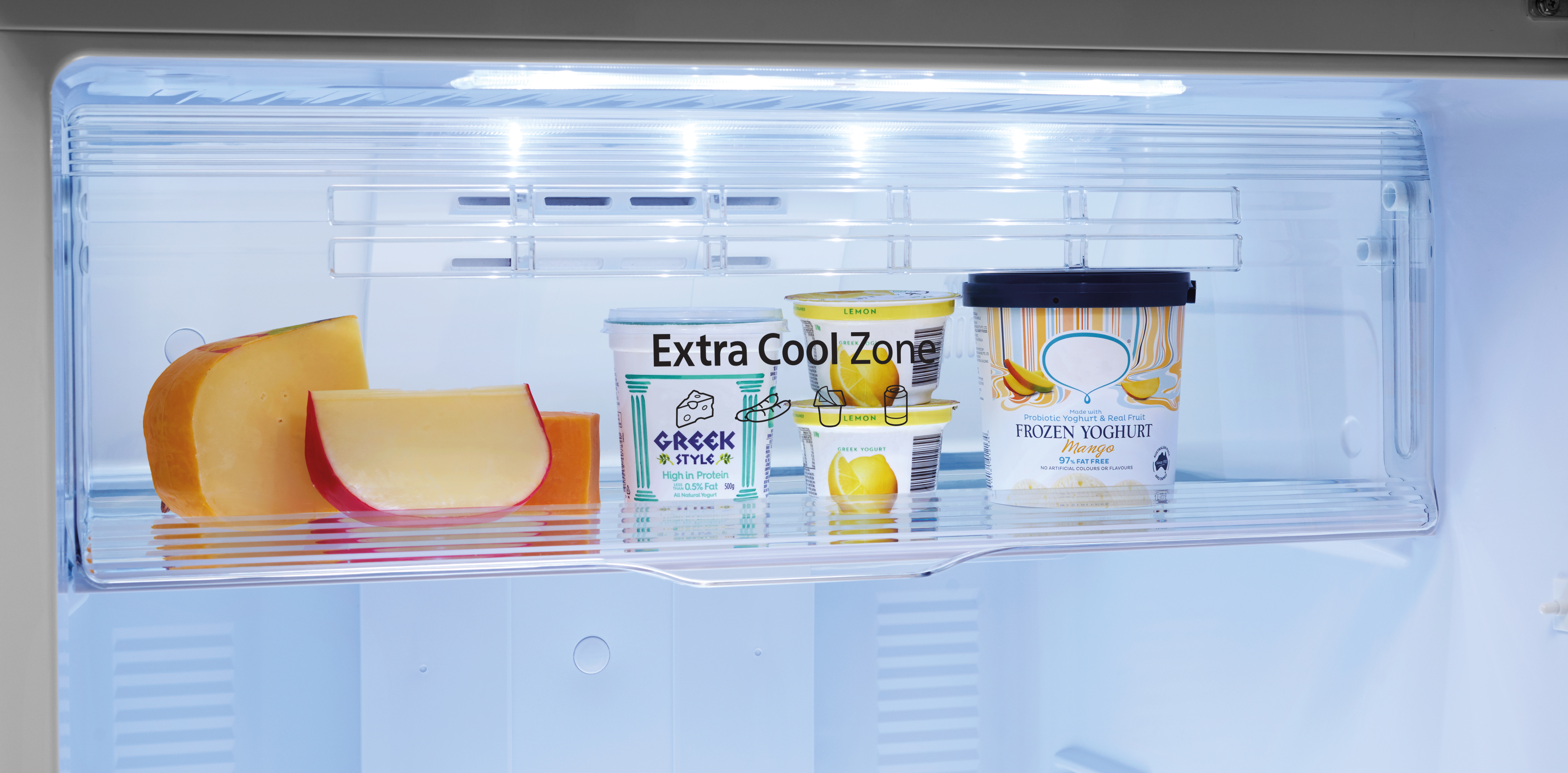 The Extra Cool Zone is fantastic for chilling drinks or cooling something quickly. The cover cools items at approx. 2°C, slightly colder than the regular fridge compartment at approx. 4°C.