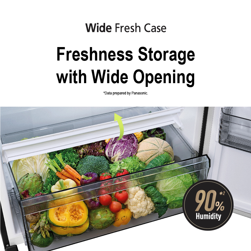 Thanks to the flap, the Wide Fresh Case lets you store even large vegetables and fruits easily. It maintains the ideal 90%*¹ humidity that keeps them crisp fresh longer.