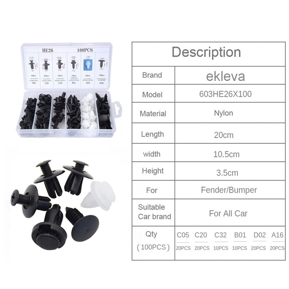 • Quantity: 100PCS=1 Box Application: Universal Package included: 20PCS*C05+20PCS*C20 +10PCS*C32 +10PCS*B01 +20PCS*D02 +20PCS*A16 Rivet Fasteners + 1PC*Plastic Box