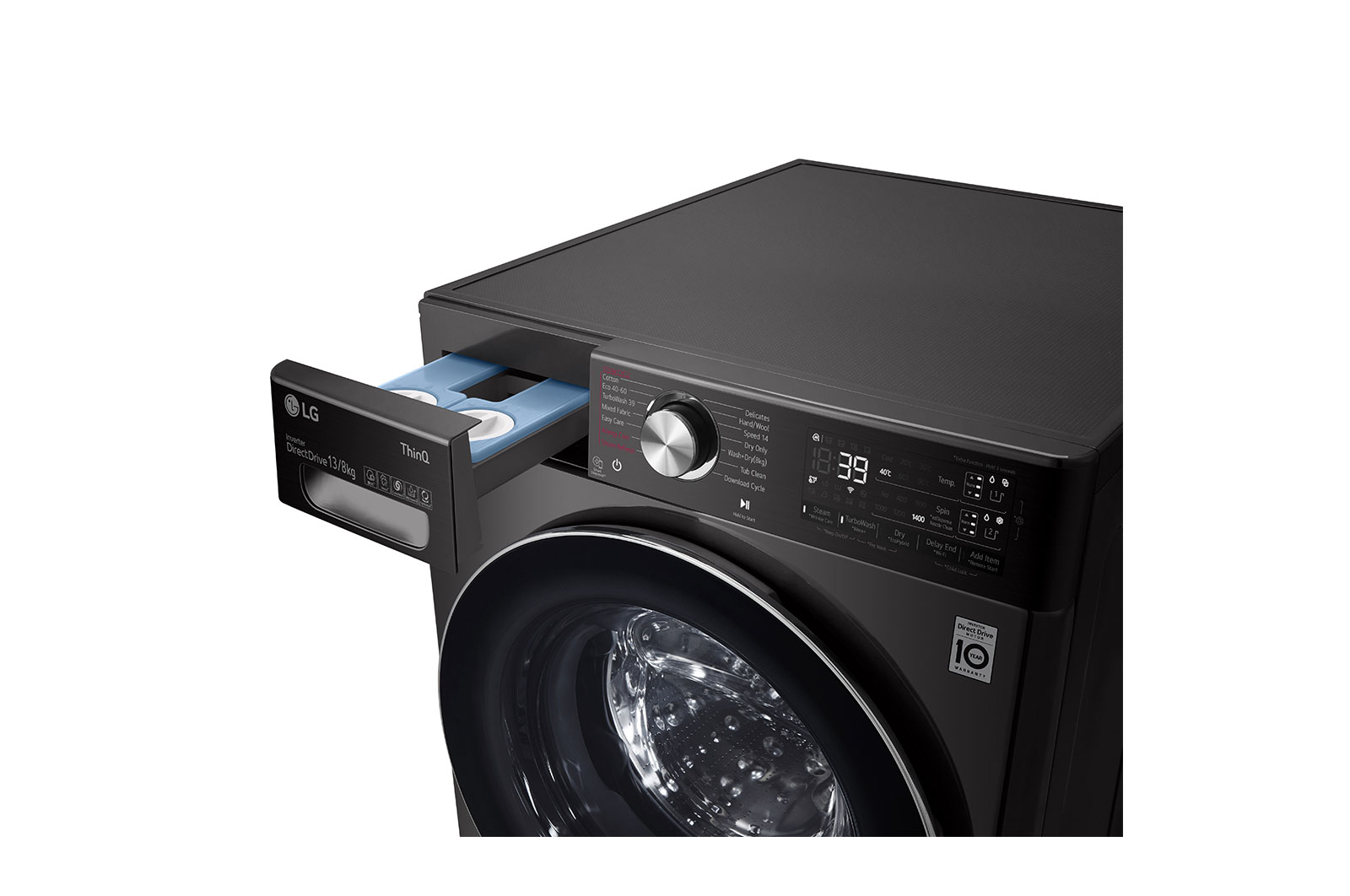 • Turbo Wash™ 360˚. With TurboWash™360˚, your laundry can be thoroughly done in just 39 minutes with more fabric protection. 4 directions of 3D multi nozzles which reaches every inch of your laundry.