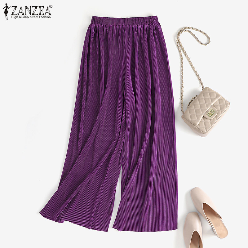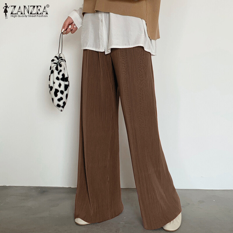 ZANZEA Korean Style Womens Elastic Waist Casual Long Pants Wide Leg Pleated Trousers