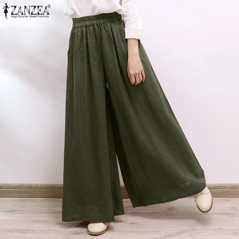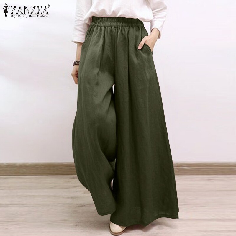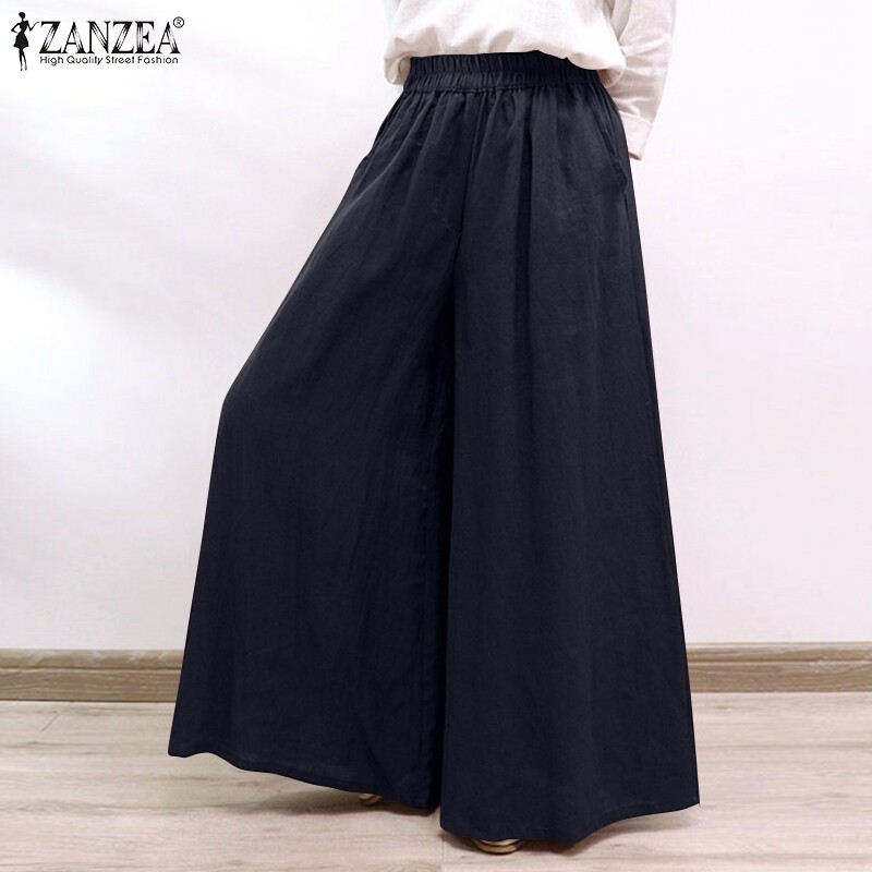 ZANZEA Women Casual Baggy Solid Color Thin Pants Wide Legs Elastic Waist Long Trousers