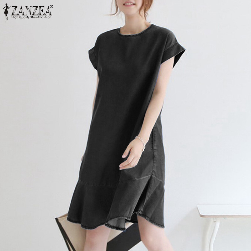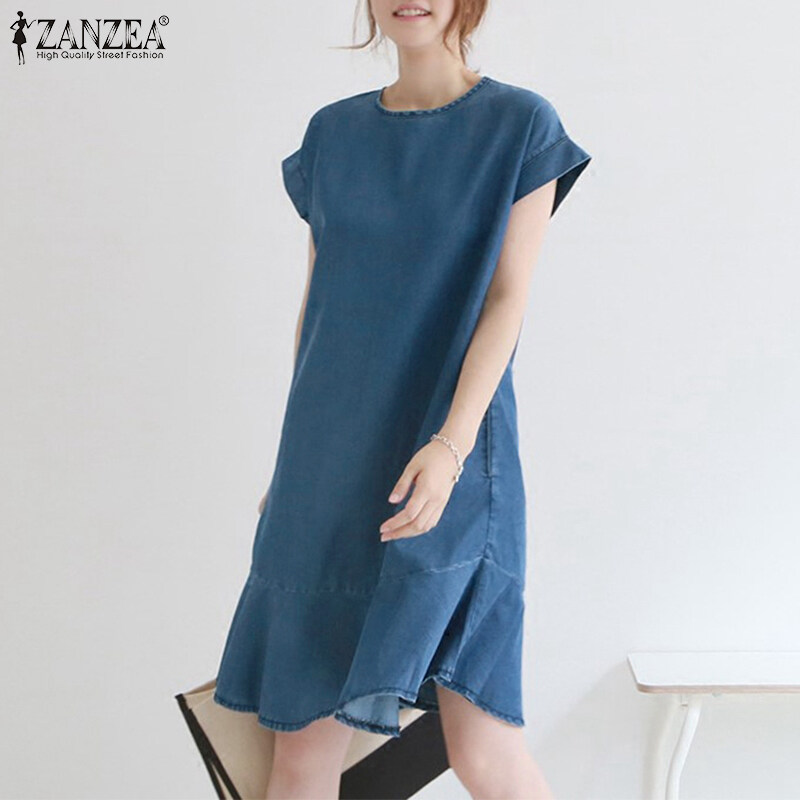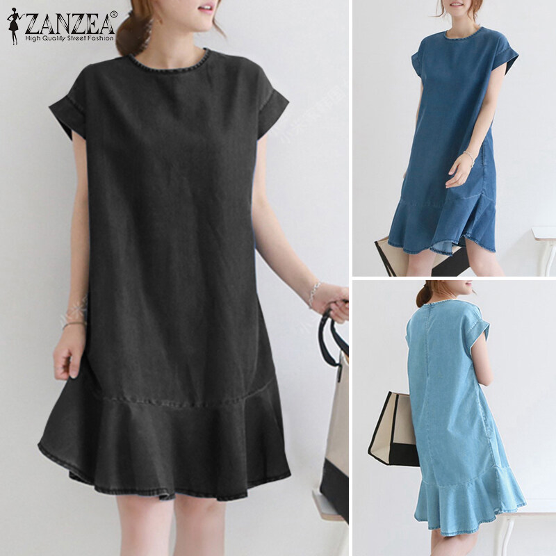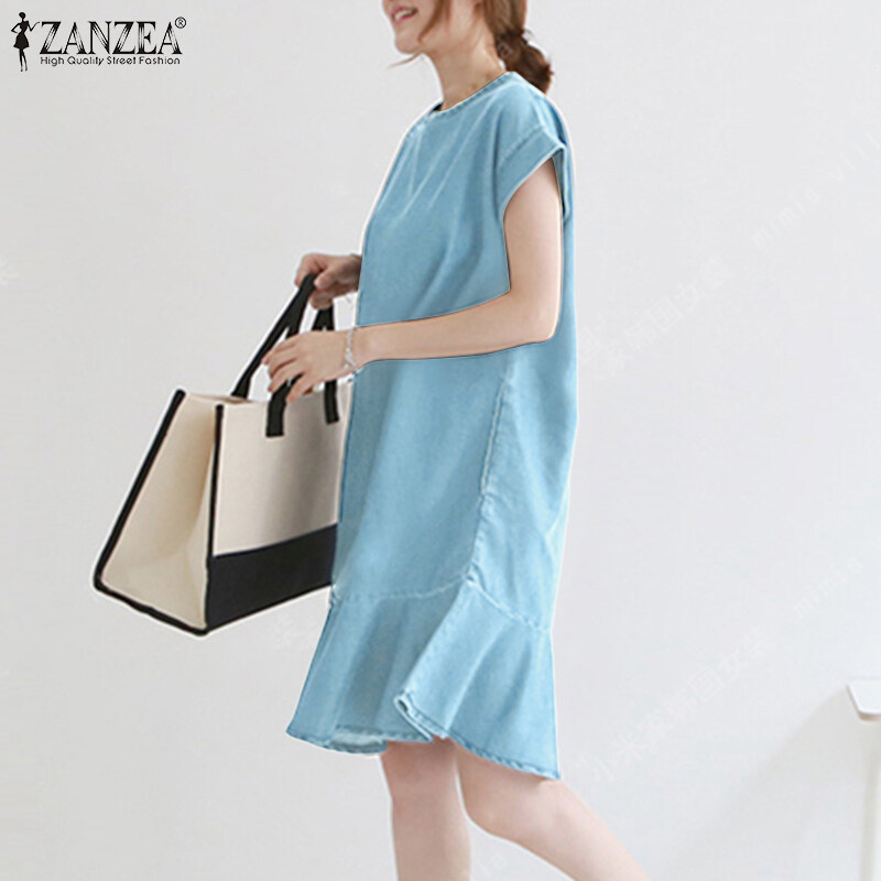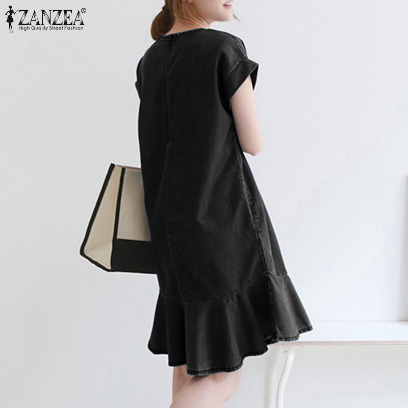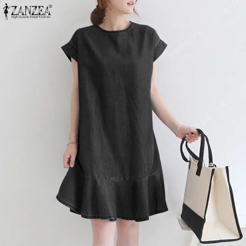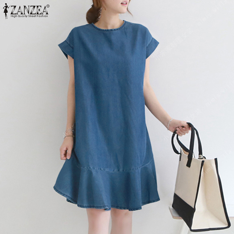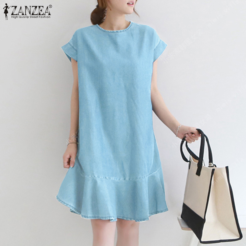 ZANZEA Korean Style Women O Neck Mini Dress Short Sleeve Ruffle Hem Loose Denim Dresses
