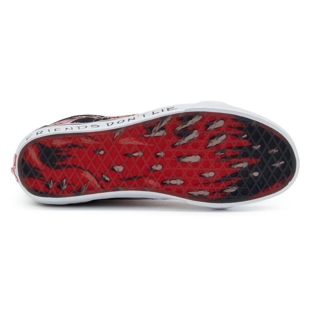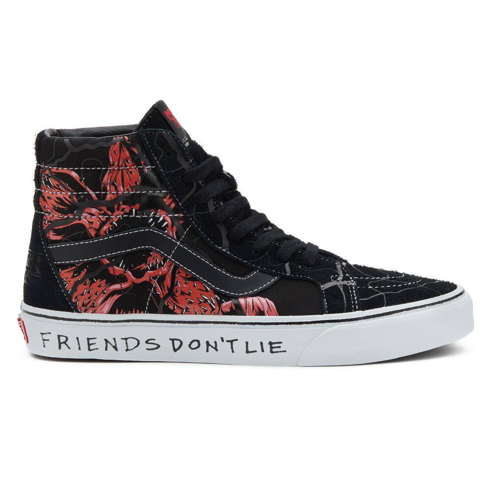 The Vans x Stranger Things 4 collection brings the Stranger Things world to life. Travel to the Upside Down, Surfer Boy Pizza, Hawkins Indiana, and more through Vans’ playful apparel and footwear.Featuring Demogorgon graphics and a red and black colorway honoring the show’s iconic opening credits, the Vans x Stranger Things Sk8-Hi Reissue blends our legendary high-top shoe with the original monster haunting the heroes of Hawkins. Along with a “Friends Don’t Lie” print at the sidewalls, this sidestripe silhouette includes supportive padded collars and signature rubber waffle outsoles, ensuring that you’re always Off The Wall and Upside Down, ready for your next epic adventure.Just grab your group of best friends, a waffle(sole), and get ready to be propelled into the world of Vans x Stranger Things 4.•Vans x Stranger Things collection•Vans’ legendary high top reissued with a vintage sensibility•Durable suede and canvas uppers•Demogorgon graphics•“Friends Don’t Lie” sidewall print•Red and black colorway•Lace-up closure•Re-enforced toe caps•Supportive padded collars•Signature rubber waffle outsoles