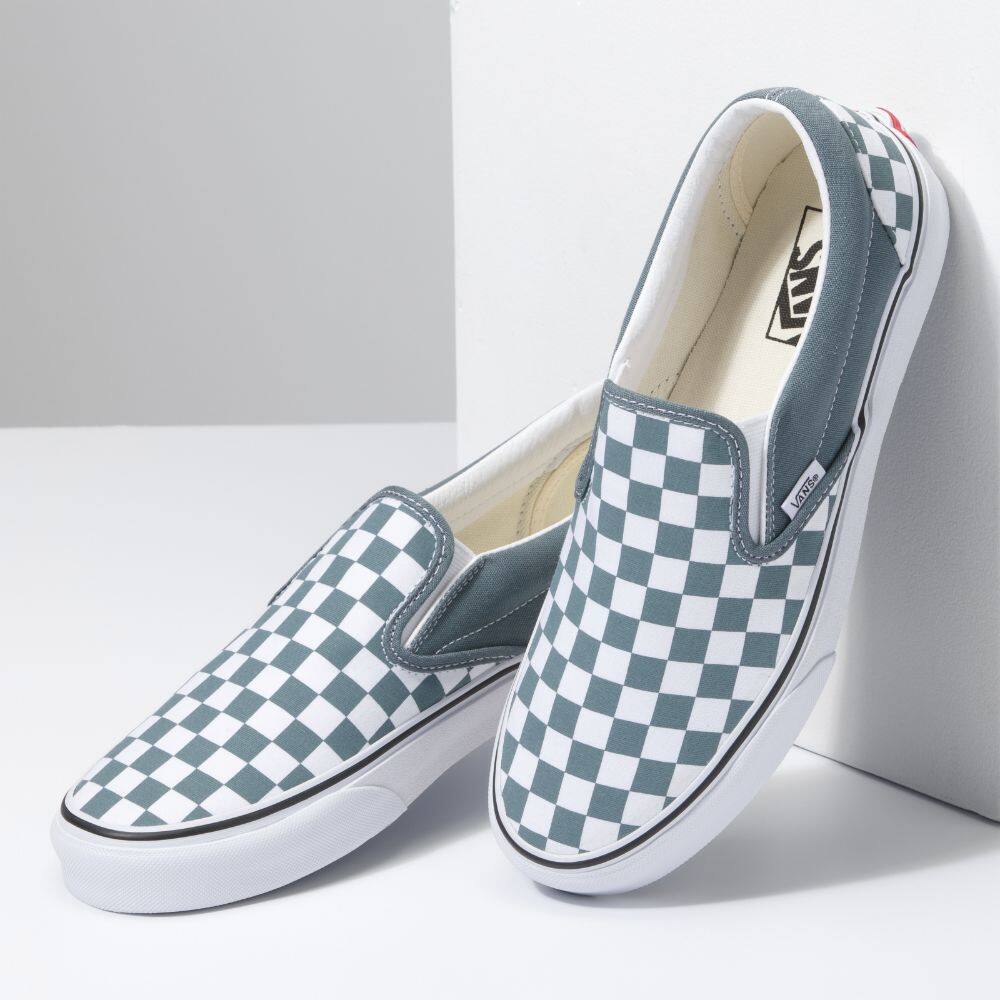 The Color Theory Classic Slip-On features sturdy low profile slip-on canvas uppers with the iconic Vans checkerboard print, padded collars, elastic side accents, and signature rubber waffle outsoles.