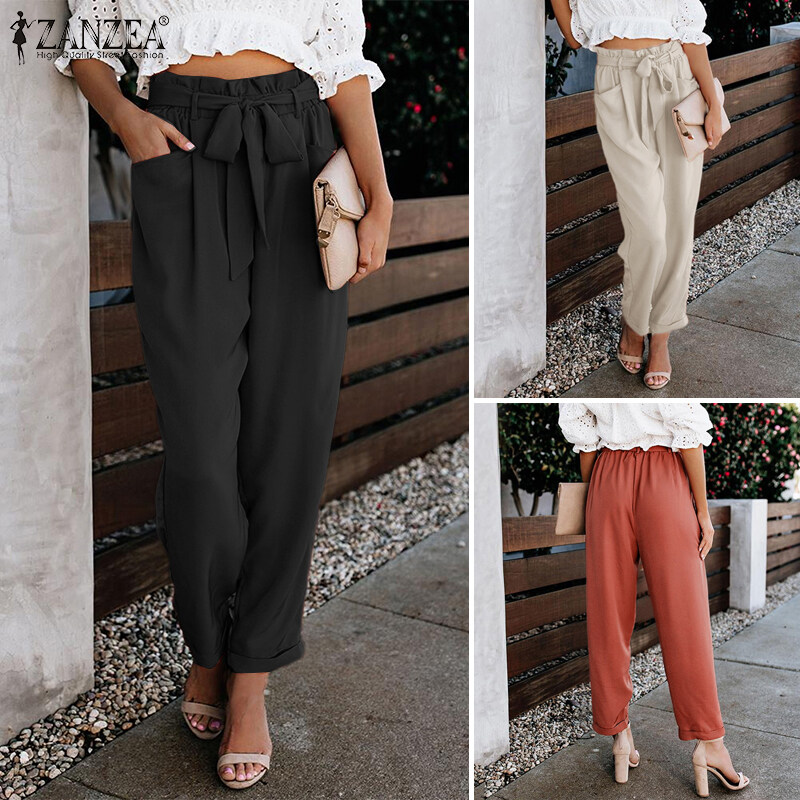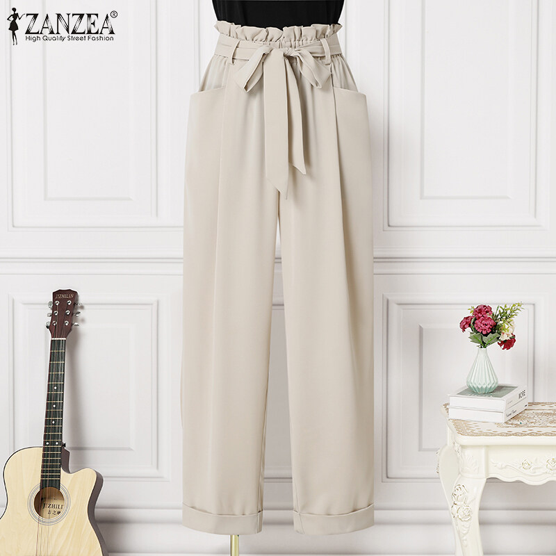 ZANZEA Women Ruffle Trim High Waist Pants Elastic Waist Fashion Commuted Straight Pants #15