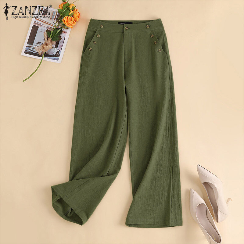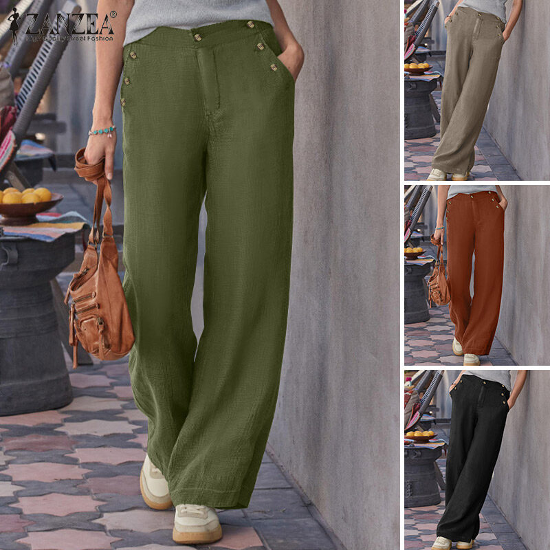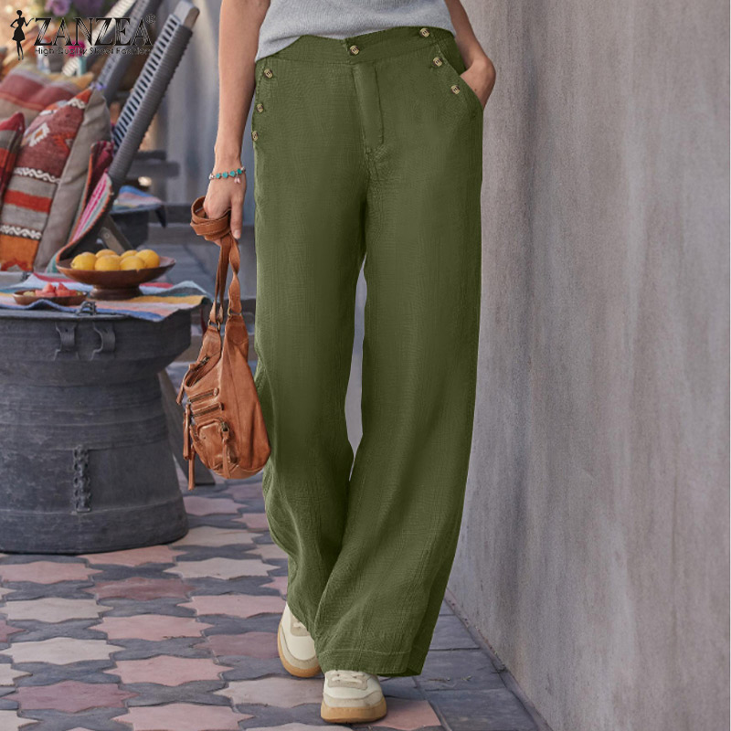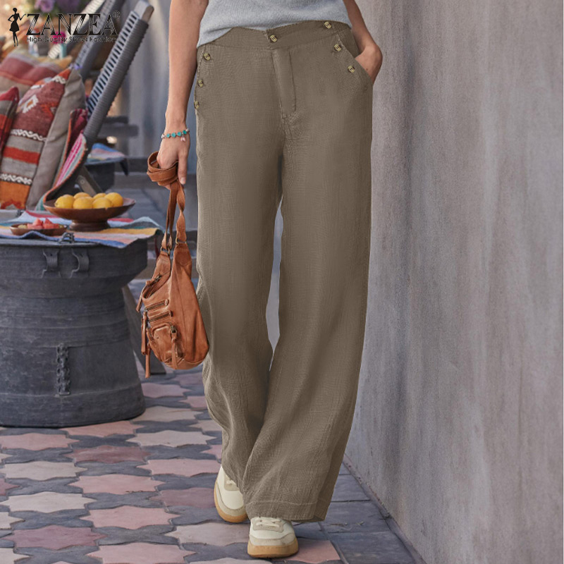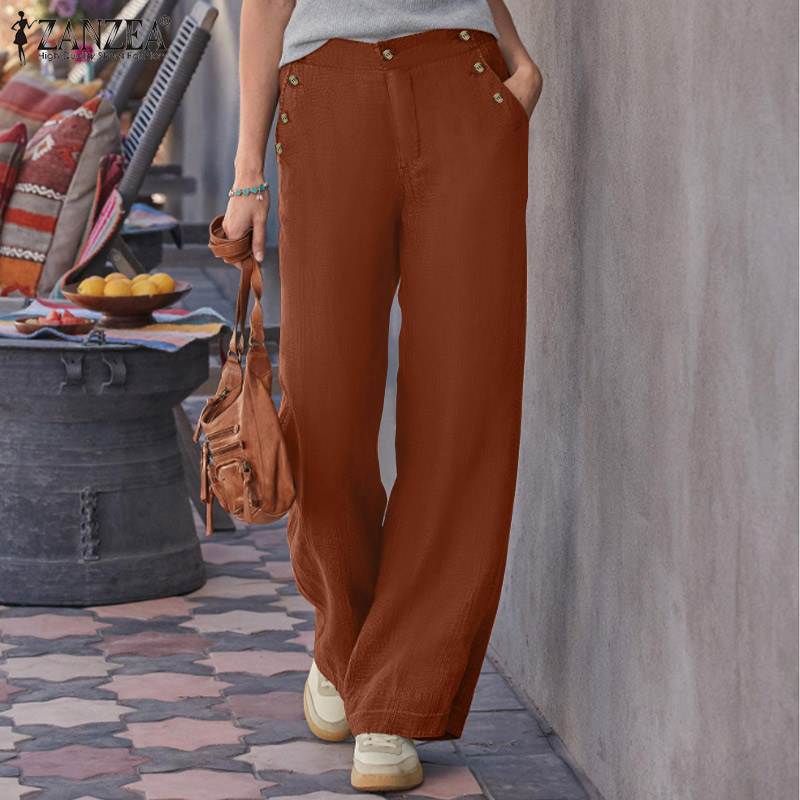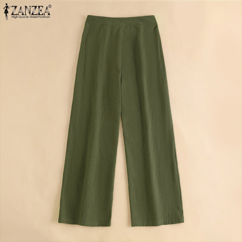 ZANZEA Women's Vintage Simple Wide Leg Solid Trousers Casual Cotton Loose Straight Long Pants #15