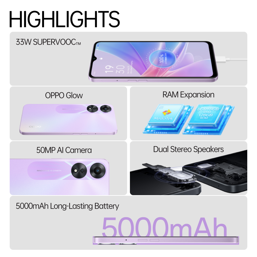 OPPO A78 5G / Up to 16GB RAM / Dual-Stereo Speakers / 33W SUPERVOOC / 5000mAh Long-Lasting Battery