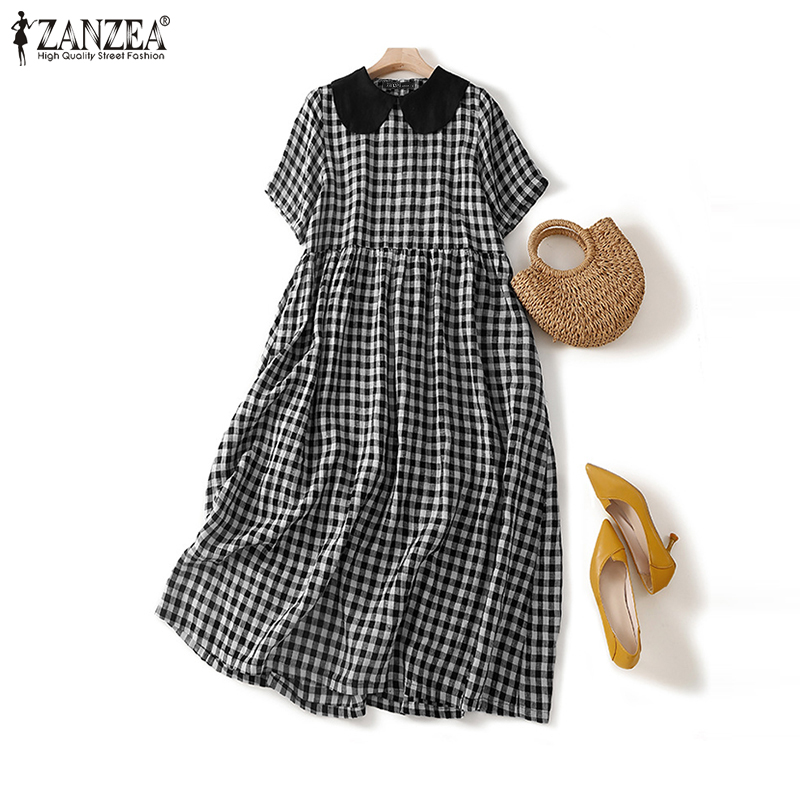 ZANZEA Women's Vintage Commute Lattice Printed Maxi Dresses Fashion Lapel Pleated Sundress #2