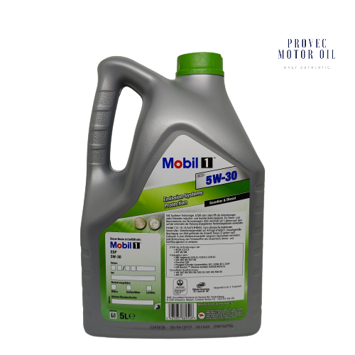 Advanced performance synthetic engine oil designed to help provide exceptional cleaning power, wear protection and overall performance. Mobil 1 ESP 5W-30 has been expertly engineered to help prolong the life and maintain the efficiency of emission systems in both diesel and gasoline powered automobiles. Mobil 1 ESP 5W-30 meets or exceeds the requirements of many leading industry and car manufacturers' standards required for newer modern diesel and gasoline powered passenger car engines.